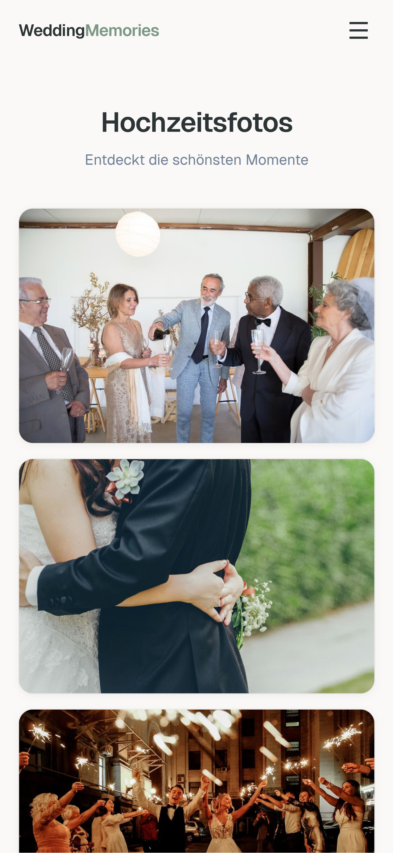 Alle Hochzeitsfotos eurer Gäste landen automatisch in einer übersichtlichen, passwortgeschützten Galerie – nur für euch und eure Gäste.